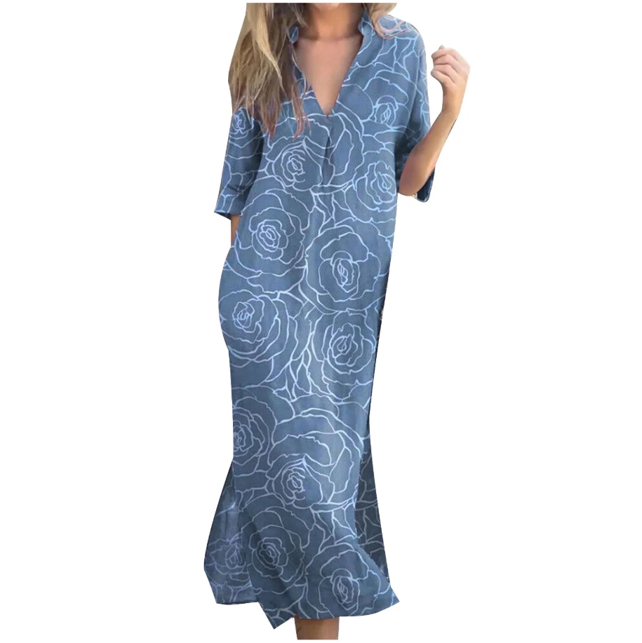 Don't miss out on a dress that combines style, comfort, and practicality in the summer. Add our casual summer loose slit V-neck printed faux linen dress to your cart today and step out with confidence - no matter the season!